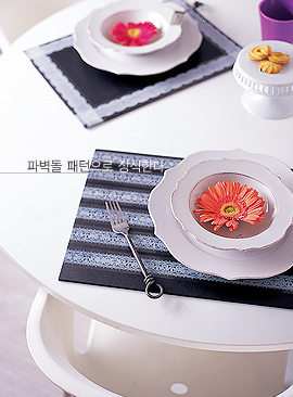 우드락으로 간단하게 테이블 매트를 만들어 보자. 블랙 우드락을 테이블 매트 사이즈로 자른 다음 화이트 레이스가 새겨진 테이프로 사방을 돌려 붙여주거나 스트라이프 모양으로 붙여 주면 끝. 블랙 컬러 위에 화이트 컬러 레이스 패턴이 도드라져 우아한 분위기가 연출된다.