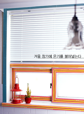 화이트 프레임과 블라인드가 있는 창가는 겨울에 차갑게 느껴지는데…. 도트와 스트라이프 패턴의 디자인 테이프를 매치해 창 프레임에 붙여 경쾌하게 꾸몄다. 자칫 두 가지 테이프의 매치가 지저분해 보일 수 있으니 한 가지는 전체 프레임에 붙여 주고, 나머지 하나의 테이프는 안쪽의 창 프레임을 마무리하면 깔끔하다.