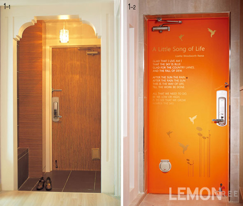 Case 1-2 타이포그래피로 장식한 데커레이션 코너 캔디 컬러의 신혼집 분위기에 맞춰 현관문을 오렌지 컬러로 래핑했다. 오렌지색 필름지는 마치 분체도장을 한 듯한 느낌. 영시를 시트 커팅해 붙이니 현관문이 훌륭한 데커레이션 월이 되었다. 아이 있는 집이라면 시도해볼 만한 아이디어.