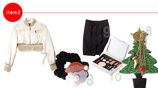 산타나 루돌프, 트리 형태 등 보는 것만으로 크리스마스를 연상케 하는 아이템으로 크리스마스 분위기를 느껴보는 것도 좋다. 너무 눈에 띄는 아이템이라면 유치해 보일 수 있으니 작은 소품 정도로 포인트를 줄 것. 헤어 액세서리나 브로치 정도의 소품을 사용하면 좋다. 숄이나 머플러, 밋밋해 보이는 블랙 컬러 재킷 위에 작은 브로치 하나는 그 어떤 소품보다도 빛나 보인다. 브로치를 선택할 때는 과감하게 화려한 것을 골라도 좋다. 또 요즘은 시즌 상품으로 크리스마스를 연상케 하는 다양한 아이템이 있으니 크리스마스 당일 포인트로 꽂으면 좋을 듯.