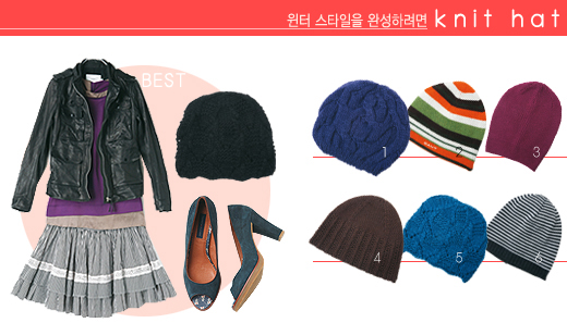 ①블루 니트 모자 9만8천원 올리브데올리브 ②스트라이프 모자 3만2천원 갠트 ③자주색 니트 모자 2만9천원 베네통 ④브라운 니트 모자 2만2천원 악세서라이즈 ⑤블루 니트 모자 2만9천원 허스트 ⑥그레이 니트 모자 2만9천원 베네통