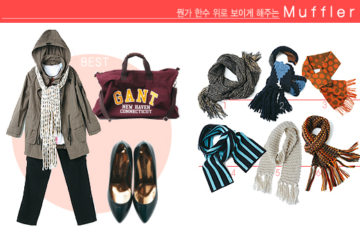 ①골드 펄 머플러 8만9천원 미닝 ②캐주얼 무드의 머플러 5만8천원 갠트 ③주황색 도트 머플러 7만5천원 SJSJ ④블루 투 톤 머플러 5만8천원 갠트 ⑤아이보리 머플러 3만2천원 악세서라이즈 ⑥무지개 머플러 4만8천원 악세서라이즈