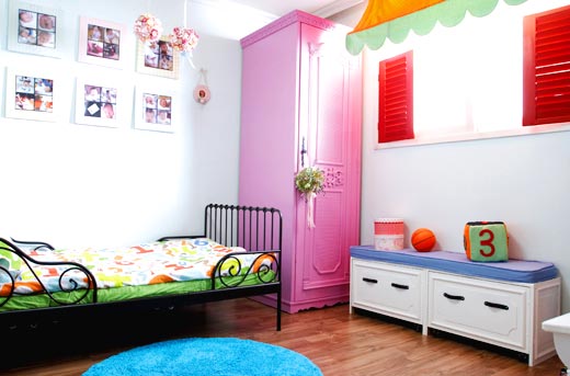 오래된 옷장은 몰딩을 새롭게 붙이고 페인팅하여 핑크색 공주님 옷장으로 재탄생했답니다. 옥션에서 3만원에 구입한 조립식 토이 박스는 화이트 페인트를 칠한 후, 낡은 가죽 끈으로 손잡이를 만들었어요. 그 위에 파란 천으로 매트를 올려놓으니 멋진 베드벤치가 되어 아이 방이 더욱 멋스러워졌어요.” 소현 맘 박금화 씨(5세, 5개월, 34세)