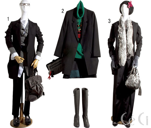 1 everyday 블랙과 그레이의 톤온톤 코디네이션은 지적인 이미지를 극대화한다. 가장 안에 입는 옷부터 아우터까지 단계별로 점점 어둡게 매치하는 컬러 코디네이션 또한 추천할 만하다.