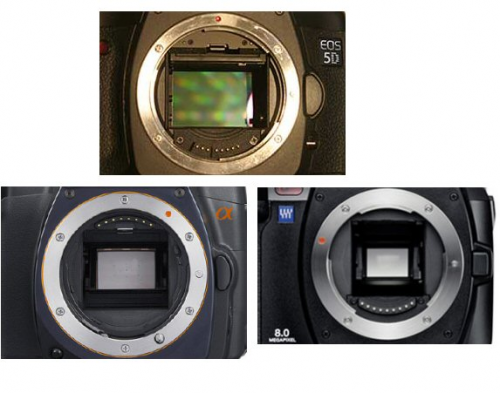 캐논 5D의 풀사이즈 이미지 센서(중)과 1.5배 크롭 DSLR의 이미지 센서(좌), 올림푸스의 포서드 이미지 센서(우). 센서 크기가 필름과 비교해 각각 1:1, 1:1.5, 1:2의 비율이다.