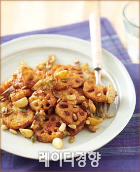 1 연근은 껍질을 벗기고 0.5cm 굵기로 썰어 연한 식촛물에 담갔다가 건져 물기를 닦는다. 2 피망과 양파는 0.7×0.7cm 굵기로 썬다. 3 녹말가루에 찬물을 부어 1시간 정도 그대로 두어 녹말이 가라앉으면 윗물의 맑은 물을 따라 버리고 끈적한 전분에 달걀흰자를 잘 섞는다. 4 ①의 연근에 ③의 반죽을 입혀 170℃로 예열한 기름에 넣어 앞뒤로 노릇하게 튀긴다. 5 너트류는 큰 것은 반으로 썰고 마른 팬에 볶는다. 6 팬에 양념장을 넣고 센 불에 살짝 끓여 끈적해지면 튀긴 연근과 준비한 채소, 너트류를 넣고 골고루 버무려 낸다.