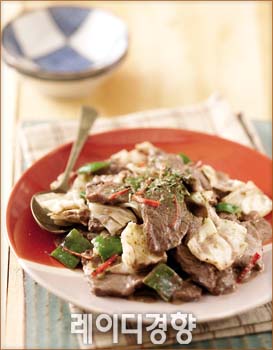 1 쇠고기는 핏물을 빼고 밑간해 1시간 정도 재운다. 2 양배추와 양파, 피망은 1.5×1.5cm 크기로 썰고, 마늘은 대충 다진다. 3 홍고추는 1cm 굵기로 어슷썬다. 4 달군 팬에 올리브유를 두르고 마늘을 볶아 향이 나면 양배추와 양파, 피망, 홍고추를 넣고 다시 한번 볶은 뒤 쇠고기를 넣은 다음 센 불에 볶는다. 5 ③의 팬에 화이트와인을 넣어 향을 내며 볶은 뒤 생크림과 스테이크소스를 붓고 뭉근하게 끓인다. 6 소금과 후춧가루로 간한 뒤 파슬리가루를 뿌린다.