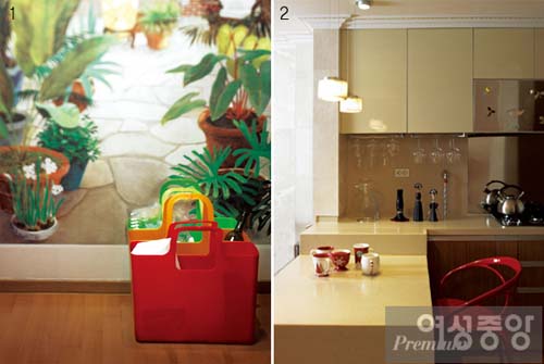 그녀의 집은 호텔처럼 깔끔하게 정돈되어 있지만 심심하지는 않다. 디자인적인 생활 용품들 때문이다. 자신이 디자인한 진공 밀폐기부터 두 팔을 번쩍 드는 알레시의 와인 오프너, 리듬감 있는 곡선 라인의 빨간 의자 ‘비너스 체어’, 재활용품 수납용기조차 디자인을 넣은 플라스틱 비비드 컬러의 가방이다.