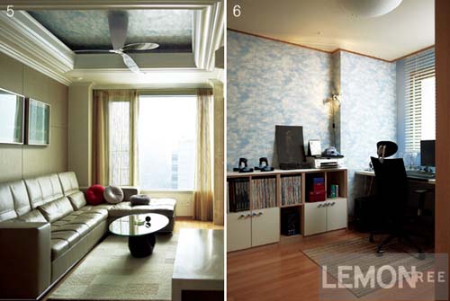 ‘헬리콥터 프로펠러’가 돌아가는 푸른 하늘이 있는 거실과 파란 꽃 초록 꽃 만발한 안방, 사랑스러운 소프트 핑크 컬러의 드레스 룸, 비행기 속에서 공부하는 느낌이 들 것 같은 구름 벽지 서재 등 38평 주상복합의 각 공간은 마치 동화책을 넘기는 느낌을 준다. 인테리어 디자이너나 스타일리스트가 고친 집과는 다르리라는 에디터의 기대가 맞아떨어졌다.