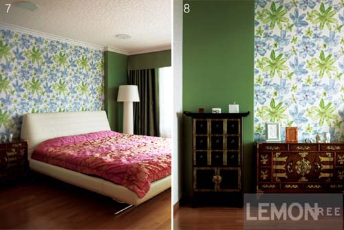 8 그린, 플라워 프린트, 한국 고가구. 인테리어를 완성한 후 가구를 찾다가 친정어머니의 한국 고가구를 가져왔는데 의외로 방의 원색 컬러와 잘 어울린다.