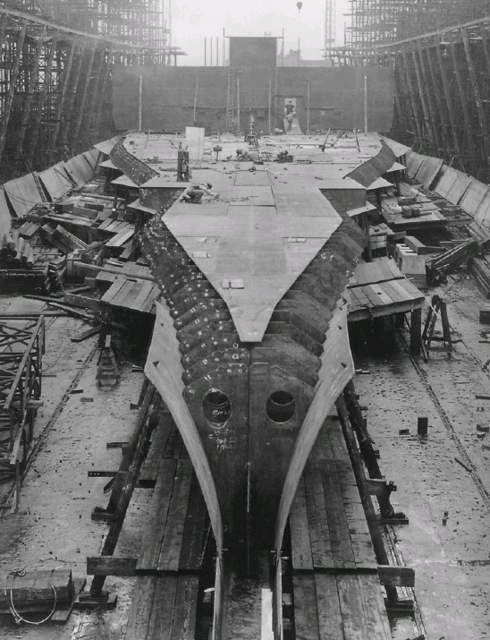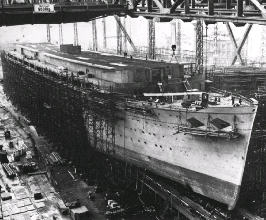 함부르크의 블롬 운트 포스 조선소에서 건조중인 구스틀로프, 현재 최 하갑판 작업중이다.