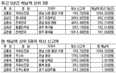 거액 재산을 갖고 있으면서도 세금을 체납한 사람과 파렴치한 범죄를 저지른 사람도 총선 후보 등록을 하는 사례가 잇따랐다. 26일 오후 총선 등록 후보자 1119명 가운데 지난 5년 동안 세금을 체납한 적이 있는 후보가 129명(11.5%)이나 됐다. 이들 중 16명은 후보 등록일까지도 세금을 내지 않은 것으로 나타났다. 체납 후보자 중에는 수십억 원대 자산가도 상당수였다. 소득세와 재산세, 종합부동산세 등의 세금을 1억원 이상 체납했던 후보는 5명이었다. 1000만원 이상 고액 체납자는 모두 21명으로 자유선진당 5명, 한나라당와 친박연대 각각 4명, 통합민주당, 무소속 각각 3명, 민주노동당은 2명을 기록했다. 체납액 2위를 기록한 한나라당 김상도 후보(경기 의정부갑)는 4억2619만원을 체납했다. 그는 24억6900만원이 넘는 재산을 신고했다. 김 후보는 세금납부 신고 대상 연도인 최근 5년 동안 매년 소득세와 재산세 등을 체납해 왔다. 지난해까지 소득세 납부를 미뤘다가 선거를 앞두고 지난달 4일에야 비로소 세금을 완납했다.