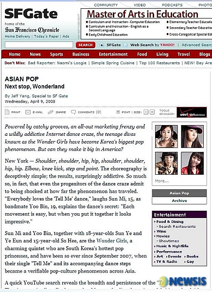 현지 샌프란시스코 크로니클 신문은 9일 자사 웹사이트에서 '아시안 팝: 넥스트 스톱, 원더랜드'라는 타이틀로 원더걸스를 소개했다.