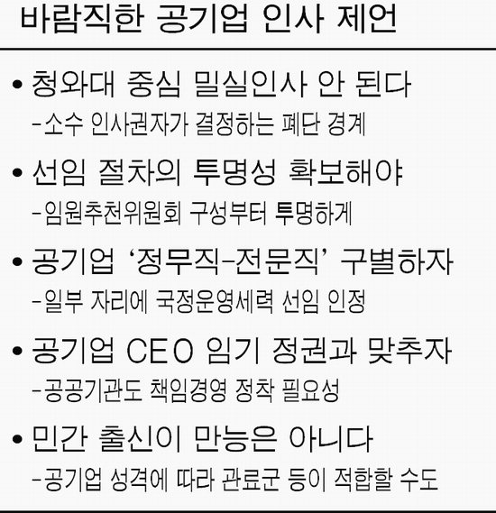 = 공기업 CEO 결정과 관련해 이 밖에도 △절차적인 투명성 확보 △민간기업 출신 인사에 대한 냉정한 평가 △공기업 CEO 임기 조정 등이 대안으로 제시된다.