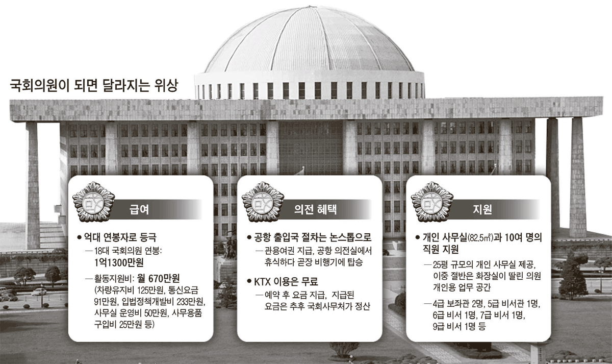 ◇10여 명의 매니저 군단=국회의원은 이와 함께 10여 명의 보좌진을 꾸릴 수 있다. 기본적으로 ▶4급 보좌관 2명(연봉 6400만원) ▶5급 비서관 1명(연봉 5300만원) ▶6급 비서 1명(연봉 3600만원) ▶7급 비서 1명(연봉 3100만원) ▶9급 비서 1명(연봉 2400만원) 등을 채용해 업무 보좌를 받는다. 여기에다 인턴 직원을 수시로 뽑을 수도 있다. 또 의원에겐 82.5㎡(25평) 규모의 별도 사무실이 제공된다. 이 중 절반은 화장실이 딸린 의원 개인용 업무 공간으로 사용한다.