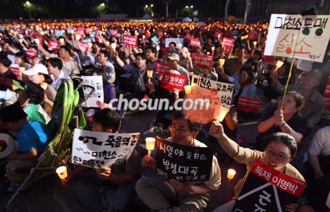 29일 밤 서울시청 앞 광장에서 열린 촛불 집회에 참가한 시민들이 촛불을 들고 미국산 쇠고기 수입조건 고시 철회를 요구하고 있다. /오종찬 기자