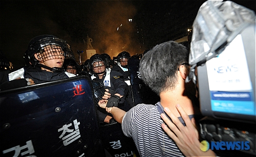 미국산 쇠고기 수입반대를 위한 촛불문화제를 마친 시민들이 2일 새벽 서울 세종로 사거리에서 가두시위를 하고 있는 가운데 방송국 취재진이 경찰에게 폭행당하고 있다. /유동일기자 eddie@newsis.com