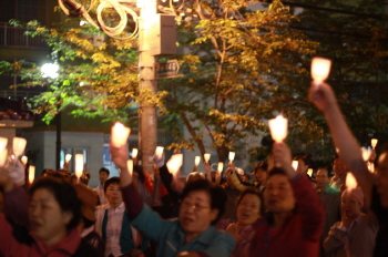 ▲ 서부이촌동 주민들이 단지 앞 노변에서 `통합개발 반대`를 위한 촛불집회를 벌이고 있다. 지역 내 북한강성원 아파트에 사는 한 주민은 아예 통합개발 안이 무산됐으면 좋겠다는 심경을 털어놨다. 서부이촌동 지역은 용산역세권 통합개발 발표와 맞물려 집값이 엄청나게 뛴 곳으로 유명하다. 개발계획이 나오기 전인 2년 전과 비교하면 집값이 2배 넘게 뛰었다.