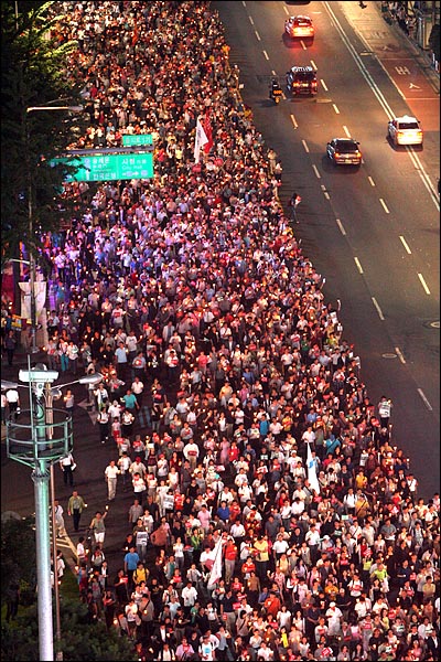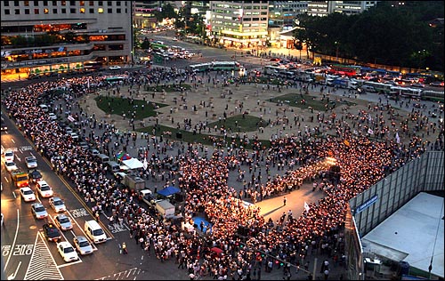 천주교 미사 진행 도중 가장 엄숙한 시간은 영성체 시간이다. 예수 그리스도의 '피와 살'을 모든 신도들이 함께 임하는 숙연한 시간이기 때문이다. 이 시간에는 항상 고개가 절로 숙여지는 엄숙한 성가가 울려 퍼진다. 그러나 이날은 '광야에서'와 '솔아 솔아 푸르른 솔아', '헌법 제1조'가 흘러나오고 있다. 신도들에게는 그야말로 진풍경이다. 두 달여 동안 '지겹게' 들어왔던 노래들이니 만큼 모든 시민들이 함께 입을 열고 노래를 불렀다. 영성체 시간도 신자들만의 시간이 아닌 모든 촛불들이 함께 하는 어울림의 장이 됐다. 밤 8시 10분경, 미사가 마무리 됐다. 다시 한번 김인국 신부가 마이크를 잡았다. 그는 시민들에게 거듭 평화 행진을 강조했다. 또한 이날의 행진의 원칙은 '침묵'이라고 말했다. 그는 "아무 말 없이 부드러운 살인 미소로 지나가는 시민들에게 함께 하자고 외치자"고 말했다. "시위의 원칙은 평화다. 평화는 세상이 주는 평화가 아니라 하늘이 주는 평화다. 우리와 뜻이 다른 분도 있다. 그 분들이 격정적인 감정 휩싸일 때 나무라지 말고 꼭 안아 달라. 단 한 번의 실수가 있어도 평화행진은 꺼지게 된다. 마치 얇은 얼음을 밟고 가듯이 조심조심, 어떤 아주머니가 출렁이는 물동이를 이고 걸어가는 것처럼 살포시 거리행진을 시작하자." 시민들은 박수로 동의의 뜻을 보내며 입을 굳게 닫은 채 하나 둘씩 시청광장을 떠나고 있다. 그들의 손에는 촛불만이 놓여있다. 얼굴에는 환한 미소가 가득하다. 또한 김 신부는 "경찰에게서 편지가 왔다"며 그 내용을 행진에 나서는 시민들에게 소개해 주기도 했다. "어제 밤은 2달여 만에 처음으로 밤 12시 전에 들어갔다며 고마워합디다, 우리 사랑하는 경찰 가족들이 오늘밤도 편안한 저녁이 될 수 있도록 도와줍시다. 전경으로 복무 중인 우리 아들들도 함께 해 줄 것입니다. 수고하는 경찰 가족들을 위해 격려의 박수를 부탁드립니다." 8천여 '촛불'은 또다시 박수를 쳤다. [5신 : 1일 밤 8시 10분]