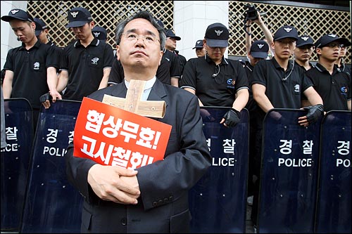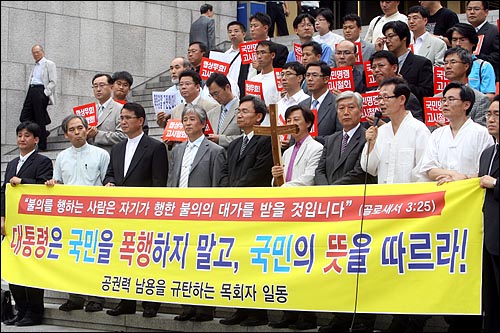 목사와 경찰이 대낮 서울 한복판에서 설전을 벌였다. 광우병 기독교대책회의 소속 목사 40여 명은 1일 오후 3시 세종문화회관 앞에서 기자회견을 열고 경찰의 촛불집회 폭력 진압을 규탄했다.