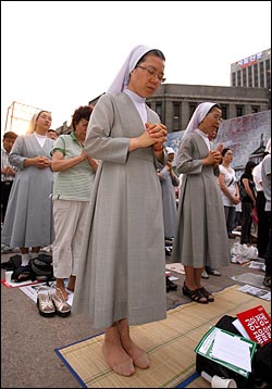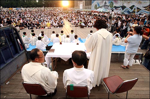 김씨는 "어떤 부모라도 아이에게 더러운 음식을 먹이고 싶어하는 사람은 없다"며 "비록 아이 엄마가 젖먹이랑 같이 있어 나오지 못했지만 우리 딸아이에게는 아빠랑 다른 어른들이 자신들의 먹거리를 챙겨주기 위해 이만큼 나왔다는 사실을 평생 기억할 수 있도록 해주고 싶다"고 말했다. 한편 이날 서울광장의 잔디는 절반 이상 뜯겨져 나간 상태다. 수십여개의 포대에는 떼어낸 잔디들이 담겨 있다. 이로 인해 시민들도 모래 바닥에 앉지 못하고 그대로 선 채 시국 미사에 참여하고 있다. 피곤한 지 잔디 포대에 기대있던 박아무개(50)씨는 다음과 같이 말했다. "나는 종교를 믿지 않는 사람이었다. 종교지도자들이 다 사기꾼 같아 보였다. 그런데 저 앞에서 있는 신부들은 좀 다른 것같다. 국민들이 종교인들과 함께 무언가를 할 수 있다는 것이 이토록 아름다운 것인지 처음 알았다. 지난번에 시청 광장에 있던 뉴라이트 목사들도 이 모습을 꼭 봐야 한다고 강조했다." 시민들은 계속 모여들고 있다. [3신 : 1일 저녁 7시] 다시 울려 퍼지는 서울광장의 기도소리 서울광장에 다시 기도 소리가 잔잔하게 울려 퍼지고 있다. 1일 저녁 6시 40분께부터 천주교정의구현전국사제단의 두 번째 비상시국미사가 시작됐다. 이른 저녁이지만 서울광장은 약 3천여 시민들이 운집해 있다. 퇴근 시간이 지나면서 시민들의 참여는 계속 늘어나고 있다. 촛불을 나눠주는 자원봉사자들도 분주하게 움직이고 있다. 무대 앞쪽에 자리한 천주교 신자들은 조용히 두 눈을 감고 주기도문을 외고 있다. 미사포를 쓴 여성 신자들의 모습도 많이 보인다. 천주교 신자가 아닌 시민들도 엄숙한 모습으로 자리에 앉아있다. 강남 도곡동에서 6살 딸과 함께 참석한 임승윤(39)씨는 돗자리에 앉아 주기도문을 외고 있다. 임씨는 "가만히 앉아 있으면 양심이 허락할 것 같지 않아 이렇게 나왔다"며 "행동하는 종교인들의 모습이 참 보기 좋다"고 말했다. 통합민주당의 안민석, 김재윤 의원도 맨 앞자리에서 앉아 시국미사에 참여하고 있다.