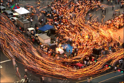 지난 주말 '경찰 폭력'에 맞서 가파르게 일렁이던 '촛불'은 이제 평정심을 찾았다. 전쟁터같았던 서울광장에는 '평화의 선율'이 울려퍼지고 있다. 7월 초의 '촛불'은 2달 전과 같이 은은하다. 천주교정의구현 사제단의 비상시국미사 두 번째날, 1만여개의 '촛불'은 김인국 신부의 부탁대로 '살인미소'만 띤 채 구호도 외치지 않고 평화 침묵시위를 마쳤다. 특히 김 신부는 이날 행진의 주제를 '바른생활'로 잡았다. 원칙은 '침묵'과 '평화'였다. 흔히 외치던 "이명박은 물러가라"는 등의 구호도 없었다. 성당에서 머리에 미사포를 한 채 두 손을 모으고 있는 천주교 신자와 같이 차분하고 조용한 분위기였다. 밤 9시 30분 시청 앞 광장에는 '헌법 제1조'가 울려 퍼지고 1만여명의 시민들이 일어서 덩실덩실 촛불을 흔들었다. 신부와 수녀들도 일어나 백합꽃을 흔들었다. 김인국 신부가 "정부가 가장 두려워하는 것은 시작할 때 시작하고, 맺을 때 딱 맺는 국민의 절도"라며 "내일 다시 뵙겠다, 안녕히 돌아가십시오"라고 마지막 인사를 건네자, 1만여명의 시민들이 차례 차례 집으로 발걸음을 돌렸다. 하지만 아쉬움이 남은 시민들은 트럭에 남아있는 김 신부의 곁에 남아 악수를 청하기도 하고, 천막으로 돌아간 신부들에게 감사인사와 격려를 전하고 있다. 밤 10시도 채 되기 전에 집으로 돌아갔지만 이들은 내일도, 모레도 그리고 오는 5일 열릴 '촛불대행진'에도 오기로 약속했다. 김 신부는 "7월 5일 토요일에 그동안 모았던 열기를 털어 넣는 평화대행진이 열린다, 토요일까지 국민들 마음을 안아드리고 다독거리고 두려움에 빠진 분들을 초대하고자 한다면 수요일, 목요일, 금요일까지 잘 견뎌야 한다"며 "내일도 이렇게 사람들 감동시키는 아름다운 일들이 벌어지길 바란다"고 말했다. 이렇게 두번째 천주교정의구현전국사제단의 시국미사는 다시 한 번 시민들의 도덕적 우위를 자랑했다. 버스가 밀린다며 욕설을 하는 시민에게는 "죄송하다"고 인사를 건넸고 "청와대로 가자"고 외치던 청년에겐 '우리를 폭도로 부르는 이들의 농간에 넘어가지 말자, 토요일이 있다"며 말했다. 서울 강북구에서 온 김승욱(38)씨는 "신부님이 나서서 차분하게 촛불 집회를 재정비하고, 비폭력 기조로 인도해줘서 나 같은 소시민도 마음 편하게 참여할 수 있게 된 것 같다"며 "종교인들로 인해 탄압받던 촛불에 큰 전환점이 되는 것 같고, 정권에서 주장하는 '전문시위꾼', '좌파 빨갱이' 등의 얼토당토않은 논리도 어느 정도 무마될 수 있을 것이라고 본다"고 말했다. "종교인들의 이런 모습, 힘이 된다"