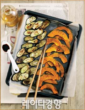 1 단호박은 속을 파낸 뒤 반으로 갈라 0.7cm 두께로 어슷하게 썰고 올리브유와 소금, 후춧가루를 골고루 뿌려 재어둔다. 2 가지는 단호박 크기와 두께를 맞춰 썰고 소금을 뿌린 뒤 간이 배면 물기를 제거한다. 3 널찍한 오븐 팬에 유산지를 깔고 올리브유를 골고루 바른 뒤 단호박과 가지를 가지런히 펼친다. 4 ③에 올리브유와 소금, 후춧가루, 파슬리를 골고루 뿌려 180℃로 예열한 오븐에 20~30분간 굽는다. 5 분량의 재료를 섞어 드레싱을 만든다. 6 구운 단호박과 가지는 한김 식혀 접시에 담고 드레싱을 뿌린 뒤 랩을 씌워 간이 배도록 잠시 두었다가 먹기 전 파르메산 치즈가루를 뿌려 낸다.