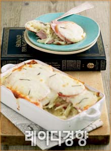 1 감자는 끓는 물에 10분 정도 설익게 삶은 뒤 식혀 가늘게 채썬다. 2 토마토는 꼭지를 떼어 0.7cm 두께로 도톰하게 편으로 썬다. 3 달군 팬에 버터를 녹인 뒤 오븐 용기에 붓으로 골고루 바른다. 4 ③에 감자-소금, 후춧가루-슬라이스 햄-토마토-감자-소금, 후춧가루 순으로 켜켜이 쌓고 마지막으로 모차렐라치즈를 듬뿍 올린다. 5 200℃로 예열한 오븐에 15~20분간 굽는다.