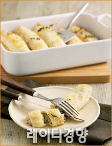 1 양송이, 양파, 부추는 깨끗이 손질해 잘게 다진다. 참치는 체에 밭쳐 기름을 뺀다. 2 달군 팬에 버터 20g을 녹인 뒤 양송이와 양파를 볶는다. 노릇해지면 불에서 내려 식힌다. 3 볼에 ②와 부추, 참치, 마요네즈를 넣고 소금과 후춧가루로 간해 골고루 섞는다. 4 깨끗한 볼에 달걀을 곱게 풀고 우유, 밀가루, 소금을 넣어 골고루 섞는다. 5 달군 팬에 버터 100g을 녹여 ③에 넣고 잘 섞어 팬케이크 반죽을 만든다. 6 깨끗한 팬을 달군 뒤 ④의 반죽을 한 국자씩 떠 올려가며 얇게 부친다. 7 팬케이크를 한 장씩 깔고 ③을 2~3큰술씩 도톰하게 올려 김밥처럼 만다. 8 오븐 용기에 ⑦을 나란히 담고 파르메산 치즈가루와 타임을 골고루 뿌린다. 9 200℃로 예열한 오븐에 ⑧을 넣어 10분간 굽는다.