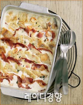 1 흰 살 생선은 1cm 두께로 포 뜬 것을 준비해 먹기 좋게 썬 뒤 물기를 제거하고 소금, 흰 후춧가루, 화이트와인을 뿌려 밑간한다. 2 달군 팬에 올리브유를 살짝 두르고 ①을 올려 앞뒤로 노릇하게 굽는다. 3 베이컨은 4~5cm 길이로 썰어 팬에 구운 뒤 키친타월로 눌러 기름기를 제거한다. 4 양파는 깨끗이 손질해 가늘게 채썬다. 5 버터 1/2큰술을 달군 팬에 올려 녹인 뒤 오븐 용기에 붓으로 골고루 바른다. 6 ⑤에 양파를 넓게 깐 뒤 흰 살 생선, 베이컨을 골고루 올린다. 7 달걀을 풀어 소금으로 간한 뒤 우유, 생크림을 넣어 ⑥에 붓는다. 8 남은 버터와 바질을 작게 잘라 골고루 뿌린 뒤 200℃로 예열한 오븐에 30~40분간 우유와 생크림이 자작하게 졸아들 때까지 굽는다.