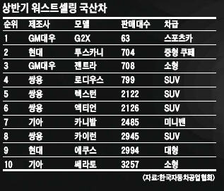 GM대우 젠트라(3위)와 기아차 쎄라토(10위) 등 소형차 역시 잘 팔리지 않았다. 경형 또는 준중형급 이상을 선호하는 소비자 기호 때문이다.