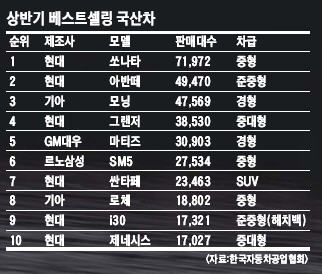 올 상반기 톱10에 새로 진입한 차는 현대차의 i30와 제네시스다. 총 1만7321대가 판매돼 9위로 기록된 i30는 국내 해치백(뒤쪽에 위로 여는 문이 달린 차량) 시장을 개척한 선구자다. 트렌디한 유럽형 디자인과 소형차 수준의 연비(ℓ당 13.8㎞,자동변속기 휘발유모델 기준)가 장점이다.