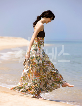 패턴이 돋보이는 클래식한 디자인의 시폰 소재 롱 원피스와 플랫 샌들을 매치해 여성스러운 비치 룩을 완성한다. 바람이 불 때마다 하늘거리는 치맛자락의 매혹적인 감각은 덤.