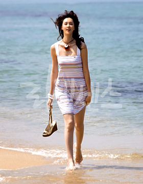평범한 디자인의 슬리브리스 원피스지만 화이트 바탕에 간결한 컬러 핀 스트라이프가 들어가 세련미가 느껴지며, 웨지 힐을 더하니 시원하고 편안한 비치 룩이 완성된다.