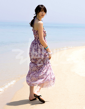 시폰 소재 특유의 하늘하늘한 질감을 잘 살린 홀터네크라인 원피스. 원피스 가득 프린트된 플라워 패턴이 여성스러움과 발랄함을 동시에 만족시킨다. 비즈 장식이 돋보이는 슬리퍼를 매치해 가벼운 느낌을 살렸다.