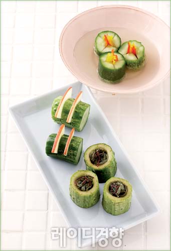 8 ③의 절여두었던 오이를 맑은 물에 살짝 헹군 뒤 물기를 빼고, ⑦을 채워 넣은 다음 통에 넣어 반나절에서 하루 정도 익혔다가 냉장고에 넣고 먹는다.