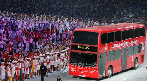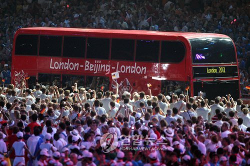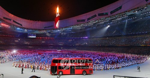 런던시는 이날 밤 오후 9시10분(현지시각)께 런던발-베이징 경유-런던행 빨간색 이층버스를 앞세우고 베이징올림픽 주경기장인 국가체육장에 입장했다.