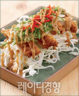 1 돼지고기는 1.5cm 두께로 슬라이스한 것을 구입해 고기 망치로 두들겨 연하게 만든 뒤 소금, 후춧가루를 뿌려 밑간한다. 2 양배추는 곱게 채썰고 양파는 얇게 슬라이스한다. 꽈리고추와 홍고추는 씨를 털어 가늘게 채썬다. 3 ①은 밀가루-달걀물-빵가루 순으로 묻혀 튀김옷을 입힌다. 4 180℃로 달군 식용유에 ③을 넣어 노릇하게 튀긴 뒤 건져 기름을 뺀다. 5 분량의 재료를 섞어 강된장 소스를 만든다. 6 접시에 양배추를 깔고 ④를 올린 뒤 양파, 꽈리고추, 홍고추를 얹고 ⑤를 뿌려 낸다.