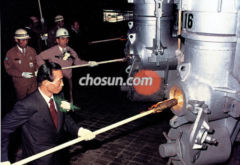 ▲ 1976년 5월 31일 박정희 대통령이 포항제철 제2고로 화입식에서 불을 넣고 있다. 조선일보DB