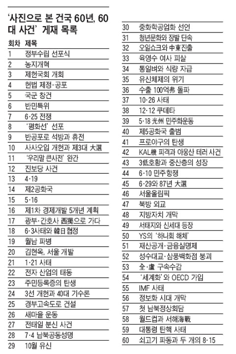 지난 6월 13일자 A1면의 '정부수립 선포식'(1회)으로 연재를 시작했던 조선일보 특별기획 '사진으로 본 건국 60년, 60대 사건'이 26일 60회 '쇠고기 파동과 두 개의 8·15'를 마지막으로 2개월여에 걸친 장정(長程)의 막을 내렸다. 건국(建國) 60년의 역사가 산업화와 민주화를 모두 성취한 자랑스런 역사라는 시각에서, 그 '발전의 궤적'을 드러내는 중요한 사건들을 중심으로 서술한 대한민국 현대사의 약사(略史)였다. 독자들의 반응도 뜨거웠다.