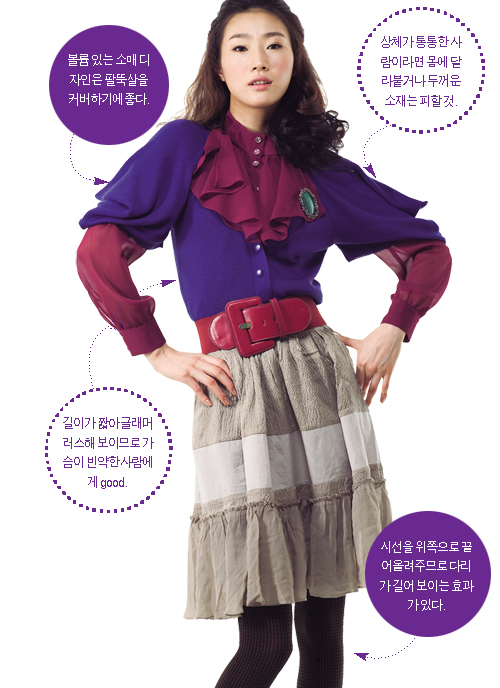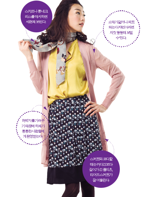 Plus Tip 롱 재킷과 레이어드해 시크한 분위기가 난다. 머플러와 일러스트 패턴 빅 백 등의 소품으로 포인트를 준다.