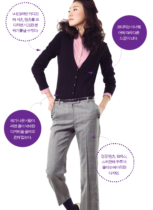 Plus Tip 톱과 카디건을 레이어드한 다음 블루종을 입어 시크한 느낌 연출. 기본형 데님 재킷과 매치해도 좋다.