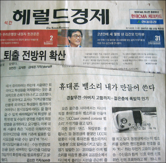 요 즘 젊은층 사이에서는 자신이 직접 휴대폰의 벨소리를 만들어 쓰는 ‘UCC(user created contents) 벨소리’가 인기를 끌고 있다.