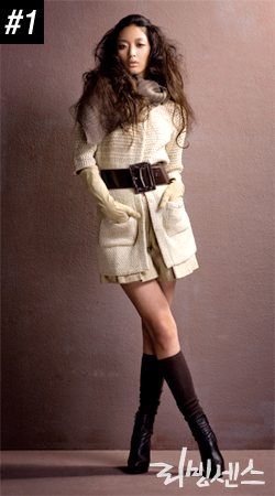 ▶ 베이지 컬러의 니트 롱 재킷, 데코. 베이지 컬러 쇼츠, 질 바이 질 스튜어트. 블랙 가죽 플랫폼 앵클부츠, 자라. 스웨이드 소재의 글러브, 브라운 와이드 벨트, 베이지 컬러 니트 판초, 모두 스타일리스트 소장품.