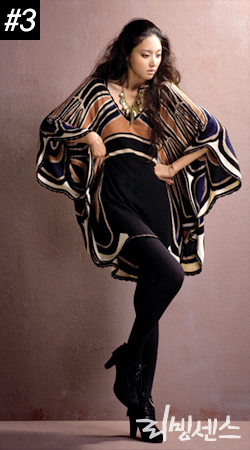 ▶ 안에 입은 블랙 컬러 프린지 슬리브리스, 르샵. 에스닉한 프린트의 니트 판초, 템퍼리. 블랙 컬러 스웨이드 앵클부츠, 자라. 블랙 니트 레깅스, 골드 참 장식이 시크한 네크리스, 모두 스타일리스트 소장품.