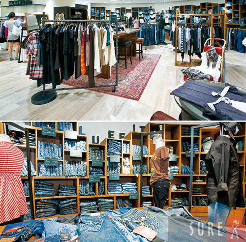 다이닝 테이블은 물론, 작업실과 응접실, 아트워크까지 훌륭하게 갖추고 있어 마치 예술가의 방에 온 듯한 느낌을 주는 블루핏은 신세계 백화점에 입점한 데님 편집 매장. 심플한 아메리칸 실용주의를 담은 데님 브랜드와 데님과 어우러지면 더 멋스러운 페미닌한 감성의 아이템들이 가득하다. 직매입 제도를 도입해 트루릴리전 등 국내 선호도가 높은 아메리칸 브랜드의 가격 거품을 대폭 줄인 것도 눈여겨볼 부분. 블루핏을 즐겨 찾는 스타는? 김혜수, 한지혜, 정려원, 윤은혜, 손태영, 변정수 등 스타일을 위한 당당한 소비를 할 줄 아는 20대 후반~ 30대의 패션 셀렙들이 대부분이다.