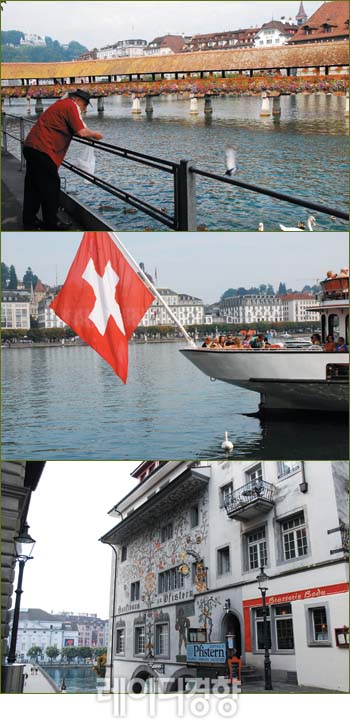 1 카펠교 앞에서 새들에게 먹이를 주고 있는 시민. 2 루체른 호수의 증기선. 3 한때 길드였던 식당. 루체른이란 이름은 1178년에 붙은 것이다. 1220년 이탈리아와 루체른을 연결하는 고타드 길이 열리면서 도시가 번성하기 시작했다. 카펠 브리지는 이후 만들어진 것이다. 다리가 건설되고 뒷산에 무제크 성곽이 세워졌다. 처음엔 수도원의 부속 영지 정도로 여겨졌던 루체른은 점점 주목받는 도시로 성장했다. 그러자 1291년 합스부르크 왕가가 수도원으로부터 도시를 통째로 사들였다. 시민들은 왕가에 저항했다. 1332년에 스위스 연방에 가입했다. 스위스는 모두 26개 캔톤(일종의 주(州))으로 이뤄져 있는데 루체른은 네 번째 캔톤이 됐다. 1386년에는 셈파크 전투에서 승리하면서 루체른은 합스부르크 왕가로부터 독립할 수 있었다. 이런 역사가 그림으로 표현된 카펠 브리지도 큰 수난을 당한 적이 있다. 1993년 누군가 불붙은 시가를 다리에 버렸는데 이 화재로 인해 다리 대부분이 소실됐다. 당시 다리 위에 걸린 그림은 모두 1백16점이었는데 이 중 85점이 불에 탔다.