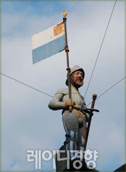 다리를 보고 나면 무제크 성곽을 둘러볼 차례다. 성곽은 1408년 완공됐다. 약 6, 7m 높이다. 성곽에 올라서면 시내가 한눈에 내려다보이게 돼 있다. 성곽 주변에는 3개의 탑이 있는데 이 중 18m의 시계탑이 가장 유명하다. 루체른의 이 시계탑은 정시보다 1분 먼저 울리는 것으로 유명하다. 역사성을 인정받아 다른 시계보다 1분 빨리 종을 칠 수 있는 권한이 부여된 것이란다. 큰 길에서는 보이지 않지만 오래된 건축물 뒤편에는 작은 광장들이 이어져 있다. 이 중 눈에 띄는 광장은 와인마켓 광장. 1370년에 지어진 옛 시청자리 앞이다.