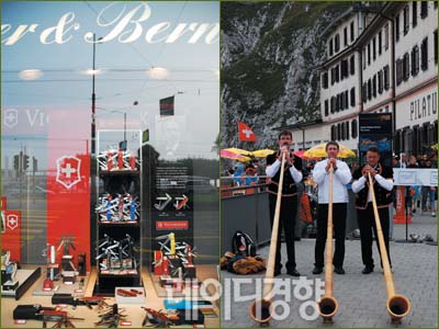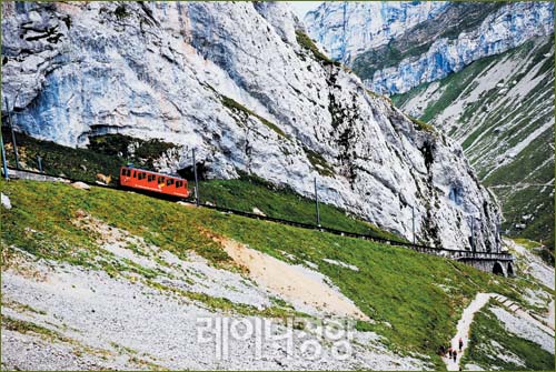 1 스위스아미 시계. 2 필라투스 알프호른 공연단. 필라투스는 성경에서 예수를 십자가에 못 박으라고 명령한 빌라도 총독이다. 필라투스는 티베리우스 황제에 의해 죽임을 당한 뒤 시신이 로마의 강에 버려졌다. 그의 시신을 버린 강줄기가 해마다 범람하자 그의 유해를 건져 묻을 곳을 찾았다. 그러다 찾은 곳이 스위스 필라투스산 정상에 있는 호수다. 시신을 묻은 이후 필라투스산은 수시로 천둥이 치고 벼락이 떨어지는 공포의 산으로 변했다. 스위스 사람들은 필라투스산에 빌라도의 악령이 산다고 믿었다. 16세기가 돼서야 루체른의 성직자들이 처음으로 산에 올라갔다. 이후 호수는 메워졌다. 지금은 호수의 흔적을 찾을 수 없다. 용에 대한 전설도 있다. 두 용이 살았는데 1421년 스탬플린이란 농부에 의해 목격됐다. 이 용은 스탬플린을 보호했지만 농부의 친구인 윙켈리드란 친구가 용의 목에 창을 던져 죽였다. 1449년에는 로이스 강에서 용이 목격되기도 했다. 1509년 시는 용의 존재를 공식으로 인정했다. 필라투스는 톱니바퀴 열차를 빼놓을 수 없다. 기찻길의 경사도는 45도. 가장 급한 곳은 경사도가 48도다. 스위스 산악 열차 중 가장 경사가 급하다. 이곳을 열차가 올라가는데 마치 무당벌레가 나무를 기어오르는 것 같다. 정상에는 호텔도 있고, 식당도 있다. 선탠 베드처럼 놓인 의자에서 관광객들이 일광욕을 하기도 한다. 동굴을 파서 만든 미술관도 있다. 동전을 넣고 생맥주도 마실 수 있다. 정상에서는 행글라이더를 즐기는 사람들도 보인다. 아름다운 호수가 보이는 산정에는 산책로도 놓여 있다. 산 아래 절벽에는 교회당도 지어놓았다. 결혼식장으로 쓰인단다. 주변에는 들꽃을 심어 풍광이 아름답다. 열차 노선 반대편 산기슭에는 케이블카도 이어져 있다. 루체른은 스위스 관광의 핵심 코스 중 하나다.