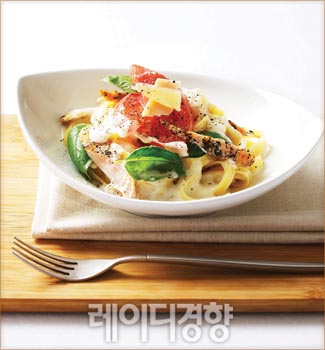 페투치니·닭 가슴살 200g씩, 토마토 1/2개, 에멘탈치즈 1/2큰술, 올리브유·소금·후춧가루·바질가루 약간씩, 크림소스(생크림·우유 1컵씩, 파르메산 치즈가루 2큰술, 소금·후춧가루 약간씩)